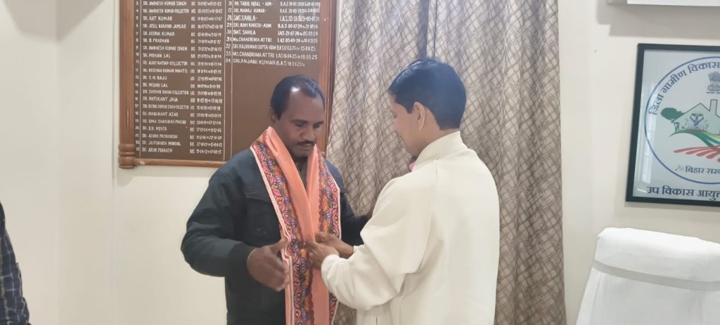 इसी कड़ी में मंगलवार को जिला पूर्णिया से मुख्यमंत्री कलाकार पेंशन योजना अन्तर्गत चयनित 02 वरिष्ठ कलाकारों को मंगलवार को उप विकास आयुक्त पूर्णिया श्री अंजनि कुमार द्वारा कार्यालय कक्ष में अंगवस्त्र भेंट कर सम्मानित किया गया। इस क्रम में सम्मान प्राप्त कर कलाकारों के चेहरे पर आत्मगौरव, संतोष एवं प्रसन्नता स्पष्ट रूप से परिलक्षित हो रही थी।