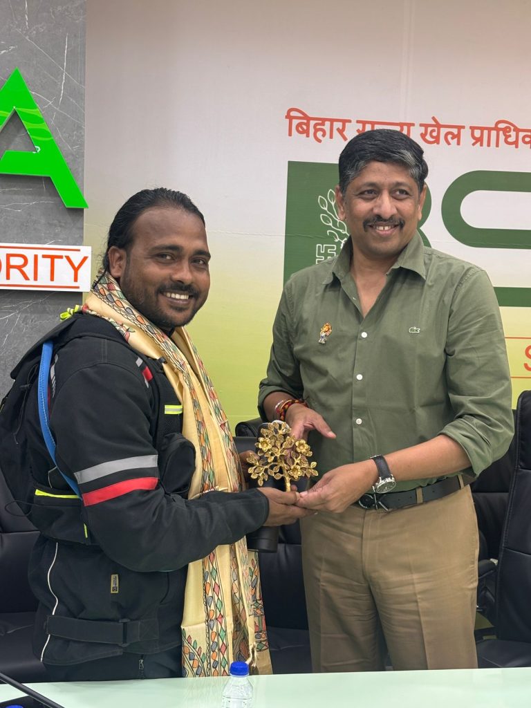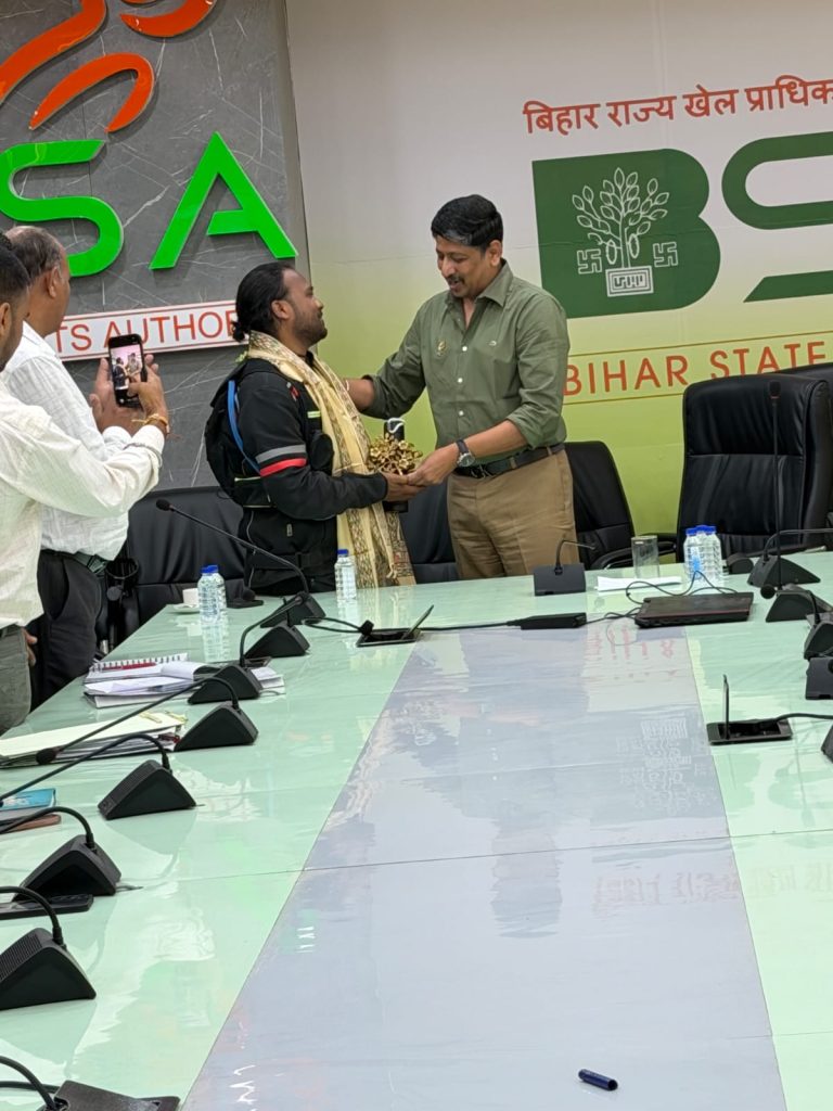 बिहार राज्य खेल प्राधिकरण के महानिदेशक सह मुख्य कार्यकारी अधिकारी श्री रवीन्द्रण शंकरण ने अंग वस्त्र और बोधी वृक्ष का प्रतीक चिह्न देकर उनका अभिनंदन और उत्साहवर्धन किया।